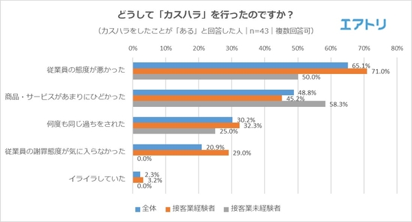 接客業未経験者の1位は「商品・サービスがあまりにひどかった」(58.3%)と商品・サービスの“質”が要因だったのに対し、接客業経験者は「従業員の態度が悪かった」(71.0%)が1位となりました。「従業員の謝罪態度が気に入らなかった」も接客業未経験者は0%だった一方で、接客業経験者は29.0%となっており、接客業経験者は経験があるからこそ従業員に対して厳しい目を向け、不満を抱くようです。