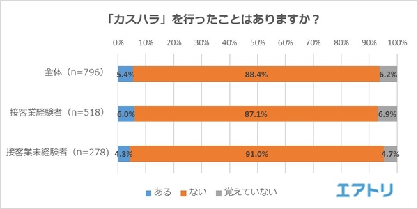 「ある」と回答したのは全体では5.4%。接客業経験者の方が「カスハラ」経験者が多い!?