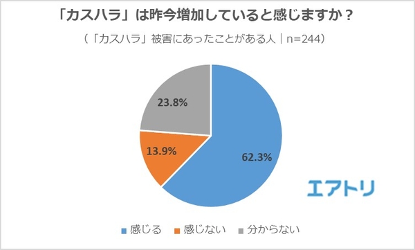 「カスハラ」被害にあったことがある人のうち、62.3%もの人が「カスハラは昨今増加していると感じる」と回答しました。