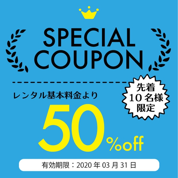 ・お一人様1回までのご利用とさせていただけます。・ご予約時にクーポンコードをご入力ください。・レンタル819名駅店のご予約のみご利用いただけます。・有効期限内であっても定員に到達した時点で終了とさせていただきます。・本キャンペーンについて予告なく変更する場合がございます。予めご了承ください。