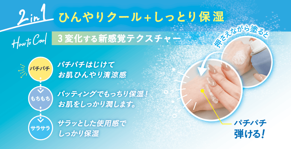 ビューティーワールドはひんやりするだけではなく、ぱちぱち弾ける爽快感の高い保湿ジェルを開発いたしました。