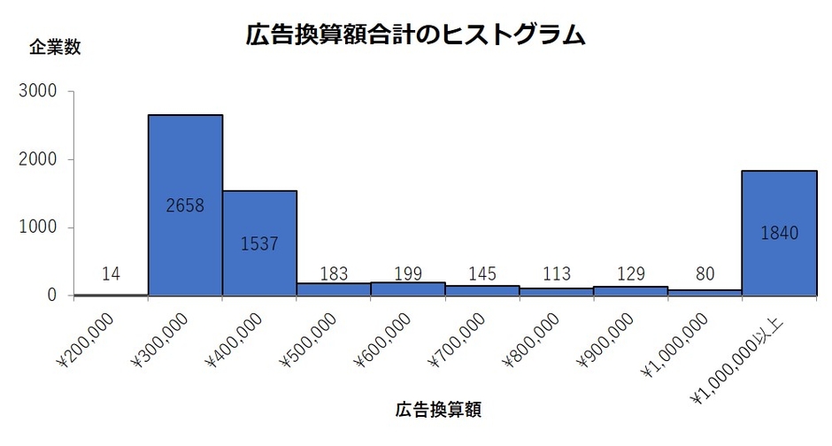 続いて広告換算額の分布図を見てみると、中央値は「300,000円」でした。この金額であれば結果として概ね「良かった」と言えます。