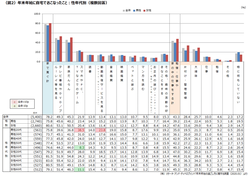 ・年末年始に自宅でおこなったこと(性年代別、ライフステージ別)