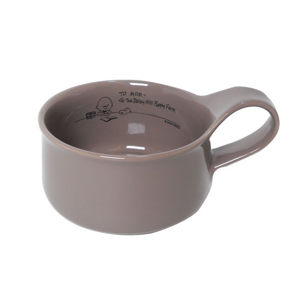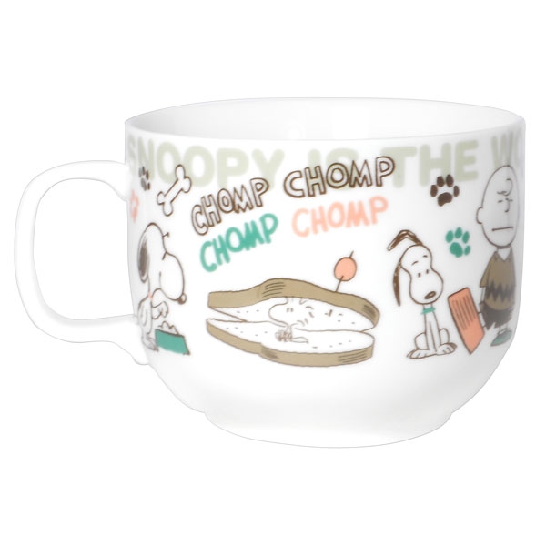 早速ご紹介していきます。淡いトーンのカラーがキュートな、スープマグです。味わいのあるスヌーピーのデザインも楽し気ですね。ワイドな飲み口で、スープもたっぷり入ります。コーヒーや紅茶などの飲み物にも、使いやすい形ですよ。
