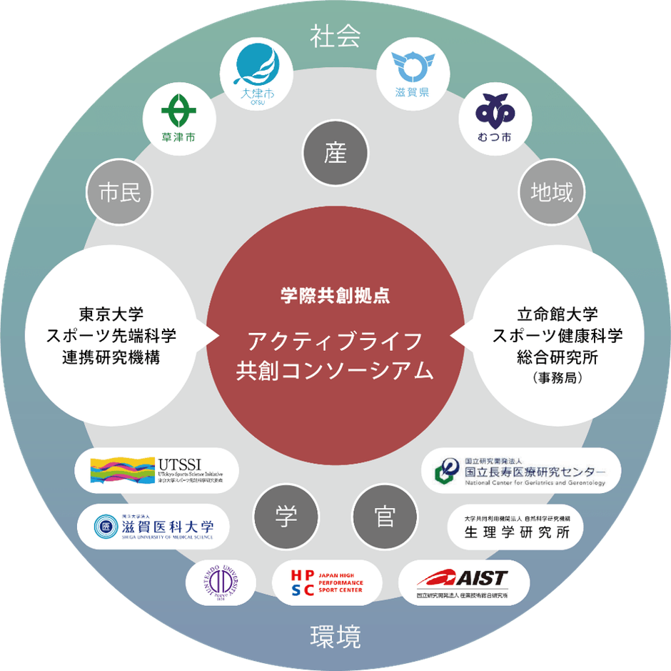 そのため、健康・長寿の実現、スポーツを通じたQOLの向上、まち・社会の健康の実現といった研究テーマを設定し、学術・研究機関のみならず産業界から地域自治体・市民にいたる産学官地の多様なステークホルダーで連携し、その研究成果の社会実装に取り組んでまいります。