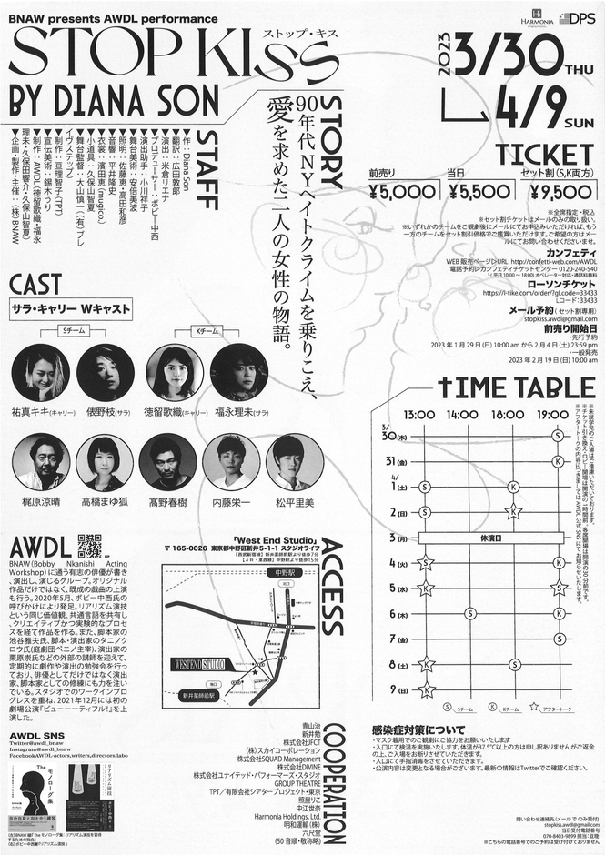 (株)BNAW企画・製作・主催、AWDL『STOP KISS』が2023年3月30日 (木) ~2023年4月9日 (日)にウエストエンドスタジオ(東京都中野区新井5-1-1)にて上演されます。チケットはカンフェティ(運営:ロングランプランニング株式会社、東京都新宿区、代表取締役:榑松 大剛)にて先行発売中です。