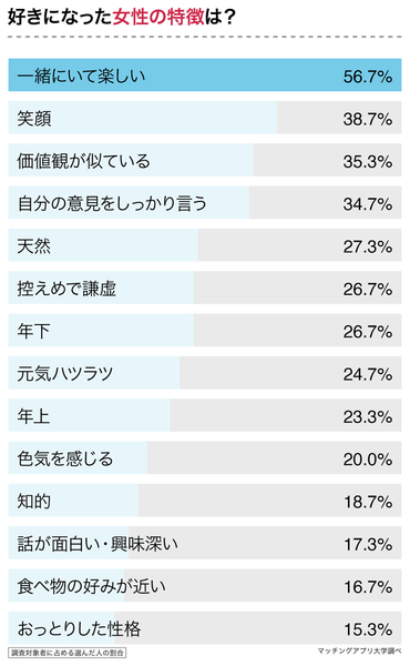 「今までにあなたが好きになった女性の特徴は?」と聞いたところ、1位は「一緒にいて楽しい(56.7%)」でした。2位は「笑顔(38.7%)」、3位は「価値観が似ている(35.3%)」、4位は「自分の意見をしっかり言う(34.7%)」と続きました。
