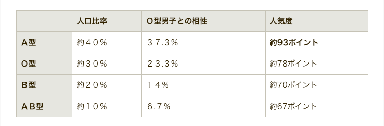 人口比率を加味しても、A型はO型男子から一番相性が良いと思われていることが分かりました。O型女子とは約15ポイント差、AB型女子とは26ポイント差でA型女子の人気が上回りました。
