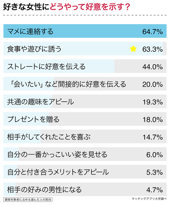 1つ前の質問で「好意を示す」「相手との関係性による」「相手も自分に好意があれば(好意を)示す」と回答した約98%のO型男子に対して「どうやって好意を示しますか?」と聞いたところ、1位が「マメに連絡する(64.7%)」、2位が「食事や遊びに誘う(63.3%)」という結果でした。
