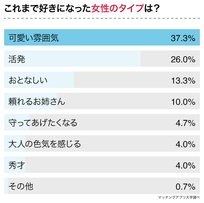 O型男子に「これまで好きになった女性のタイプは?」と聞いたところ、1位は「可愛い雰囲気(37.3%)」でした。「可愛い雰囲気」タイプの女性は、これまで同じアンケート調査を実施したA型、B型、AB型の中でも1番人気でした。