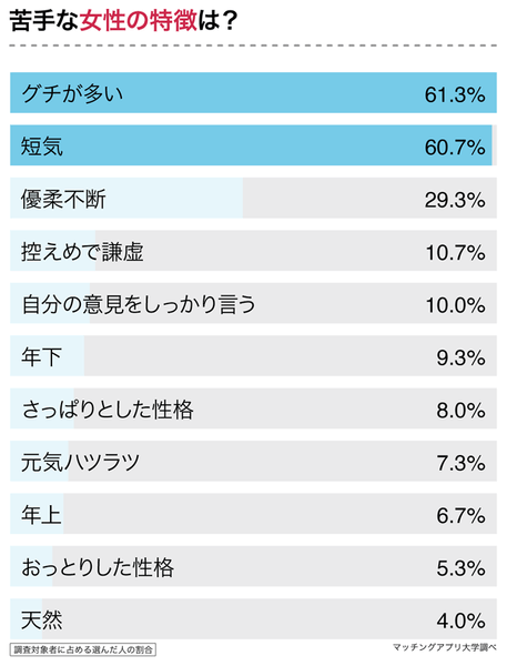 次に「今までに『苦手』『付き合うのは難しい』と感じた女性の特徴」を聞きました。1位は「グチが多い(61.3%)」、2位は0.6ポイント差で「短気(60.7%)」、3位は「優柔不断(29.3%)」でした。
