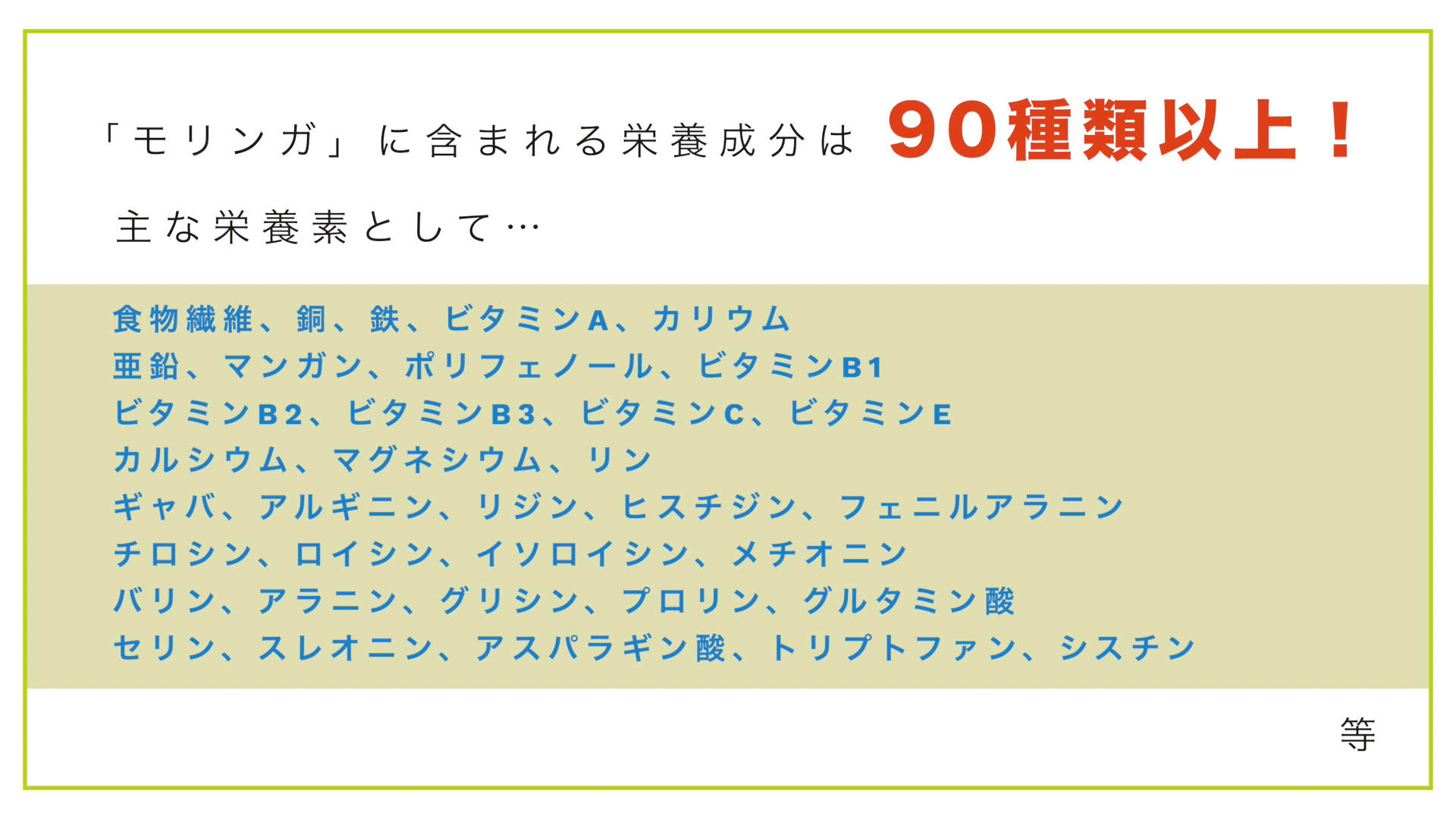 「奇跡の木」とも呼ばれる栄養素の高い植物です。そんなモリンガの葉には、