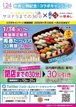 株式会社小僧寿し(東京都中央区、代表取締役・小林剛)は、2020年1月10日(金)~2020年1月31日(金)までの期間限定で、1月24日公開の映画「サヨナラまでの30分」(製作:サヨナラまでの30分製作委員会/制作・配給:アスミックエース)とのコラボ企画を開催いたします。
