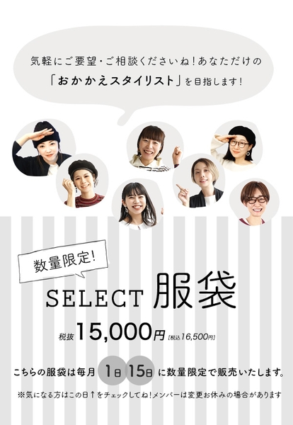 セレクト服袋は、普段のテイストや得意なスタイリング・体型などが違うそれぞれの担当スタッフの個性をページで紹介し、お客さまにお好きなスタッフをセレクトしていただき、メールでのカウンセリング後にお一人お一人に合わせたアイテムをチョイスして「服袋」としてお届けするという企画です。