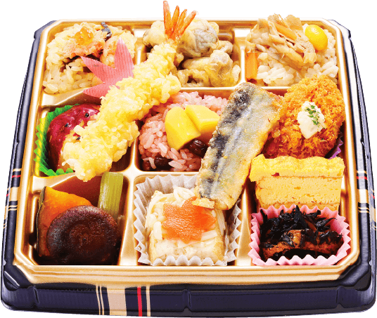 なめこ・えのき・椎茸・舞茸・カキ・さんま・かぼちゃ・さつまいも・くり・銀杏など秋の味覚が1度に味わえます。9マスの容器を使用することで、さまざまなおかずやごはんを少しずつお召し上がりいただける贅沢な御膳に仕上げました。