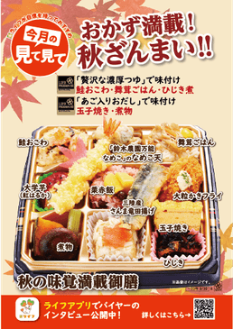 “おいしい” “ワクワク” “ハッピー” をお届けするライフコーポレーションは、昨年大好評をいただいた「秋の味覚満載御膳」を、さらに秋を感じられるようパワーアップさせ、9月1日(木)から首都圏ライフで販売しております。