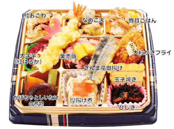こだわりは9マスすべてに秋の味覚を詰め込んだことです。紅葉の形に切ったにんじんなど、見た目にも秋を感じていただけます。特におすすめなのは食感が楽しいなめこの天ぷら・だしの効いたおこわ・大粒のかきフライです。一口ごとに秋を感じていただける、行楽にもぴったりな「秋の味覚満載御膳」、ぜひお召し上がりください。