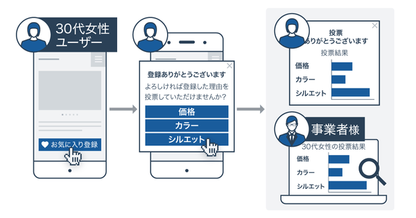 ポップアップ内のフォームコンテンツは、シンプルなアンケートに向いています。例えば「30代の女性ユーザーが、特定の商品をお気に入りに登録した際に『この商品をお気に入りに登録した理由』を選んでもらう」といった具合に、ユーザーの属性や行動にもとづいた意見収集が可能です。