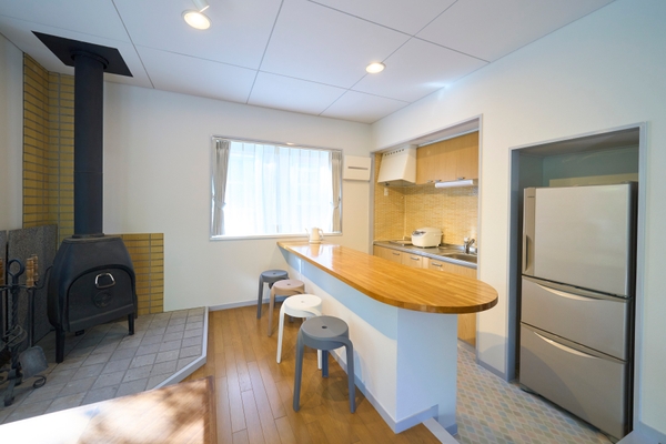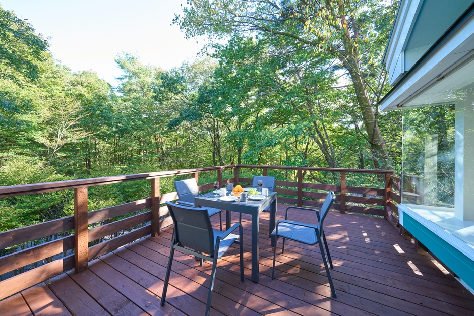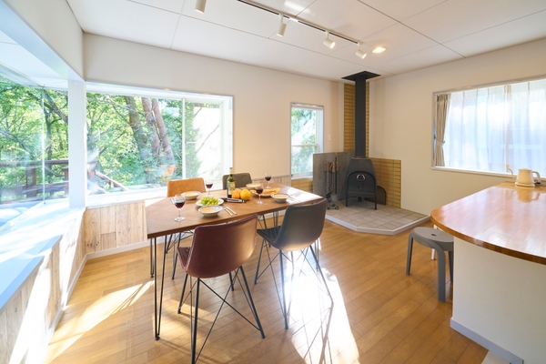 当施設は鮮やかなグリーンが特徴的な外観で、オープンにあたりウッドデッキ、駐車場を拡充、内装をリニューアルし、家具・家電も新調されています。ダイニングには大きな出窓が設置されており日差しが燦燦とさしこみます。リビングは、吹き抜けの高い天井と大きな窓が開放感を演出し、家族そろっての団欒のひとときが過ごせます。さらに、リビングとデッキテラスが繋がっており、周囲に広がる落ち着いた自然の中で森林浴やアウトドア感覚でのお食事を愛犬と共に楽しむこともできます。また、寝室は3部屋(シングルベッド×2・シングルベッド×2・布団×4)で、最大で8名様までご利用いただけます。