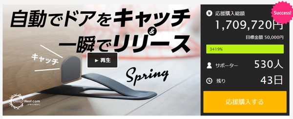 株式会社ウィズキュリオス(本社:福岡県福岡市/代表取締役:上崎 圭哲)は、しゃがまずに自動でドアをキャッチして、リリースも一瞬で済むドアストッパー【Spring/スプリング】をクラウドファンディングサービス「Makuake」にて、先行予約販売を開始して支援金額1,709,720円を超えました。