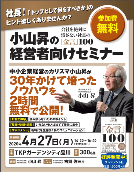 ▼小山昇の経営者向けセミナー『会社を絶対に潰さない社長の金言100』