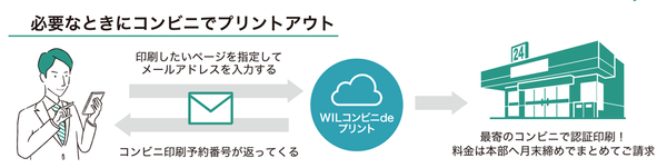 『WILテレワークブック』は、印刷したいカタログや提案資料などをオンラインで選択し、プリント用IDとパスワードを取得後、コンビニエンスストアでプリントアウトができるサービスです。しかも、プリント費用はまとめて会社に請求されるため、店頭でのお支払いは一切不要です。