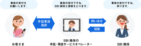 本サービスでは、スマートフォンやパソコンを通じて耳や言葉が不自由な方のコミュニケーションの仲介を行うプラスヴォイスの「代理電話サービス」を使用いたします。お客さまからのお申し出に対し、「SBI損保の手話・筆談サービス」のオペレーターがお客さまに代わってSBI損保へ電話し、ご契約手続きに関するお問合せや事故発生時の事故受付、ロードサービス手配などの内容について手話、筆談、文字チャットのいずれかで通訳を行います。