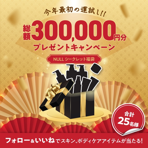 楽天、Amazonで多数の賞を獲得し、ブランド累計売上個数2,300,000個突破※のメンズコスメブランド「NULL(ヌル)」(株式会社G.Oホールディングス:大阪府大阪市)は、2025年1月1日から1月10日の期間中、いつもご愛顧いただいている皆様へ感謝の気持ちを込めて、「総額300,000円分が当たる!シークレット福袋キャンペーン」を開催しております。