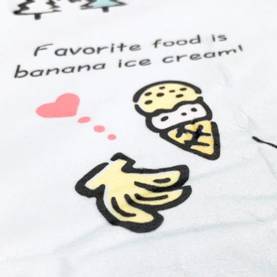 ポチャッコの周りには、アイスクリームや果物などいろんな要素が詰め込まれております。背景色が淡いブルーなので優しい印象のピロケース◎