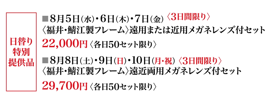 福井・鯖江製フレーム+レンズセットを各日限定50セット限りにてご用意いたします。メイド・イン・ジャパンならではの、日本人の顔立ちに合わせて設計された掛け心地の良さはもちろん、カラーやデザインにこだわってつくられています。