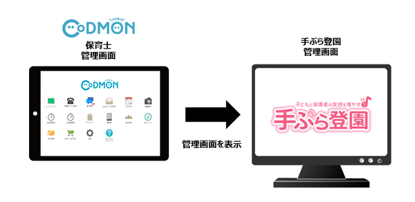 今回のシステム連携により、まず、コドモンの保育園用管理画面より、手ぶら登園サービスの管理画面に簡単に移動できるようになります。その結果、保育園では、2つのシステムを個別に管理する手間が軽減されます。