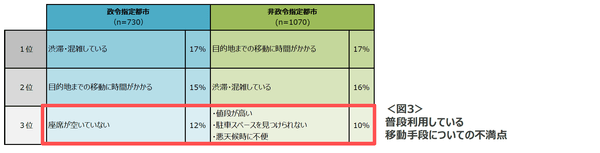 ■普段利⽤している移動⼿段への不満点を聞いたところ、【政令指定都市】では「渋滞・混雑している」(17%) 、「移動に時間がかかる」(15%)、「座席が空いていない」(12%)といった電⾞移動のシーンに関する不満が上位3項⽬としてあげられた。⼀⽅、【⾮政令指定都市】では、「移動に時間がかかること」(17%)、「渋滞・混雑していること」(16%)、「悪天候時に不便」「値段が⾼い」「駐⾞スペースを⾒つけられない」(10%)といった⾞移動のシーンに関する不満があげられた。<図3>