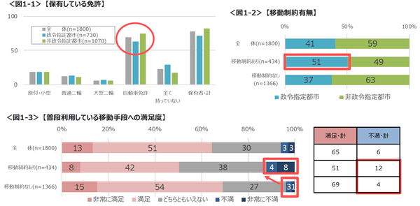 ■⾮政令指定都市よりも政令指定都市の⽅が「免許の保有率」が低く、「移動制約あり*」の割合が⾼いことが判明。また【移動制約あり】の層は、【移動制約なし】と⽐べて、約3倍以上も「移動⼿段に"不満"」と回答していた。<図1-1~3>