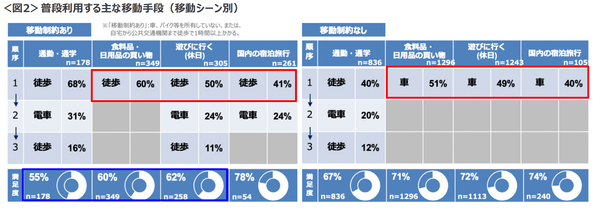 ■普段利⽤する主な移動⼿段について、移動シーン別に確認したところ、どのシーンにおいても【移動制約なし】の層では「⾞」移動が主流であるのに対し、【移動制約あり】の層では「徒歩」「電⾞」の割合が⾼かった。また移動シーン別の満⾜度も、【移動制約あり】の層が総じて満⾜度がやや低い傾向が明らかとなった。<図2>