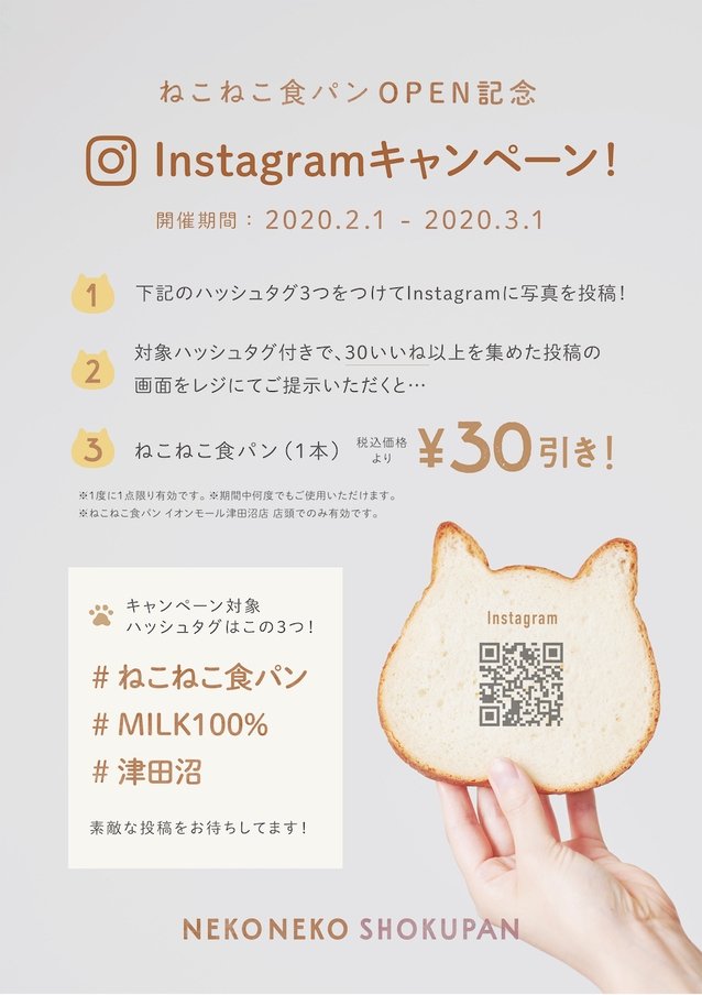 ご自身のインスタグラムに下記の3つのハッシュタグを付けて「ねこねこ食パン」を投稿していただき、「♥30いいね」をゲットすると、ねこねこ食パン1斤が30円引き!