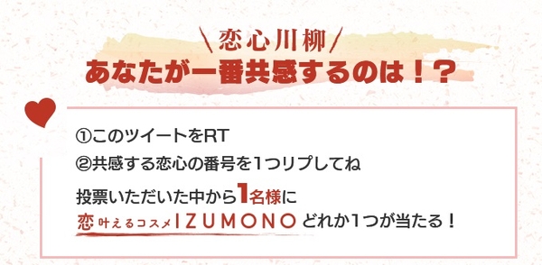 恋叶えるコスメ『IZUMONO(いずもの)』の販売を行うゲンナイ製薬株式会社(本社:東京都千代田区、代表取締役社長:上山永生)は、恋心を5・7・5に込めた「恋心川柳」を、2020年3月13日~23日にTwitter上で募集しました。多数の応募作品の中から厳選した5作品を、当社公式Twitter(https://twitter.com/gennaiseiyaku)で発表し、3月26日~4月2日に一般投票を行います。
