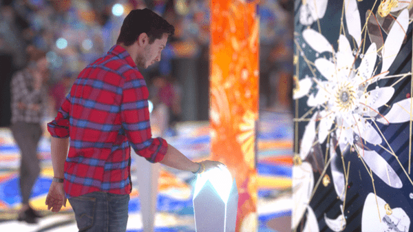 中に入ると、まるで万華鏡のような世界が広がり、中に配列されたエモーショナルセンサーに手を触れると、触れた人の感動などに応じた6種類の花が咲き誇り、美しい「夢の花」が現れます。