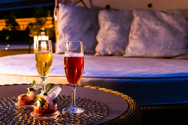 1日3組限定!ベイエリアが目の前に広がる、プライベート感たっぷりの2人掛けのゆったりとしたソファシートです。 プレミアシート限定でグラスシャンパン&スペシャルアミューズがついてきます。お子さまやご希望の方にはグラスシャンパンの代わりにノンアルコールドリンクをご用意いたします。
