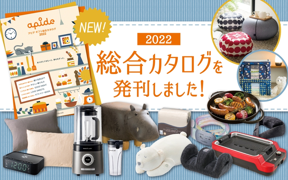 ギフト用品・生活雑貨の卸売を行うアピデ株式会社(所在地:大阪市中央区、代表取締役社長:中村 雅昭)は、「2022年版 ギフト総合カタログ」を発刊しました。