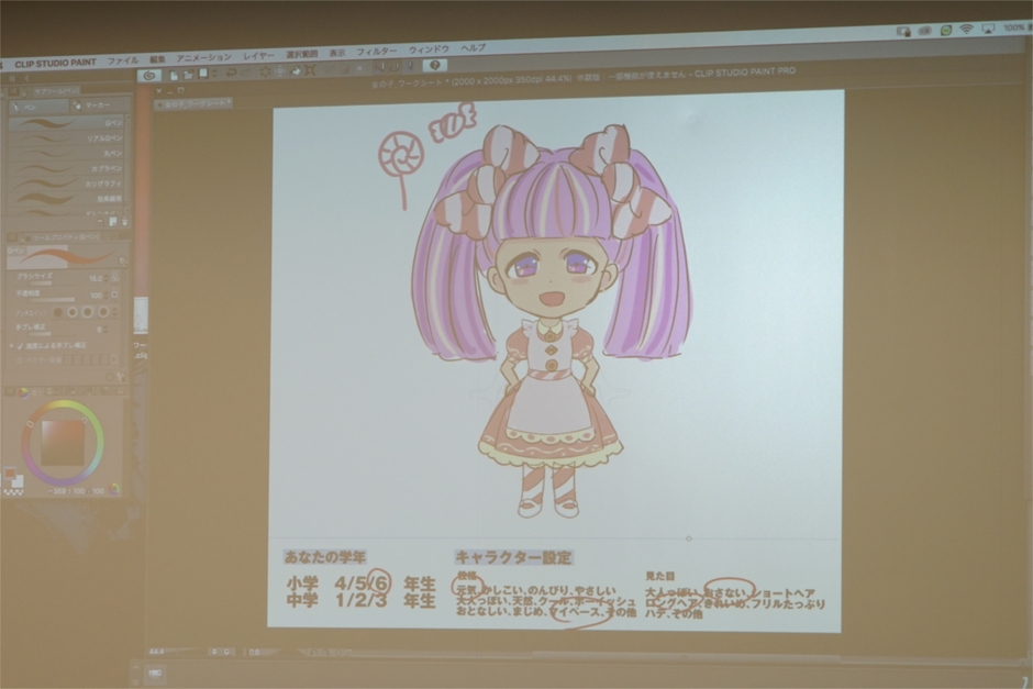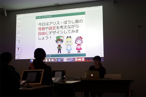 ワークショップのテーマであるゲームキャラクターのデザインを説明している様子。