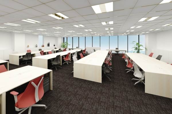 大きな開口部を持つ南面側は、白を基調とした明るいデスクが並び、社員が快適かつ機能的に使えるワークスペースとなっています。
