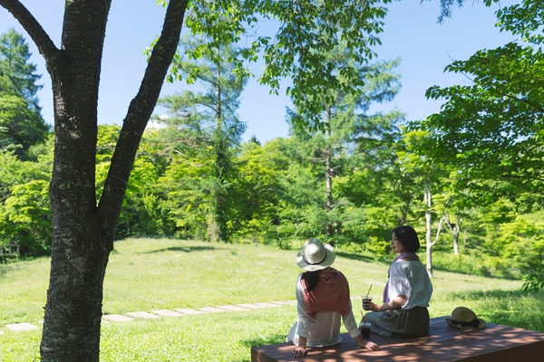 星野温泉 トンボの湯の前には、2つのオープンエア空間「もみの木広場」と「カラマツの丘」が広がっています。入浴後に高原の風に吹かれてひと休みしたり、近くの「カフェ ハングリースポット」で、ドリンクやソフトクリームをテイクアウトしてくつろいだりするのにぴったりの場所です。
