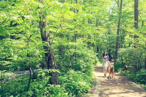 星野エリア内の施設は、森を縫って伸びる川辺の遊歩道でつながっています。ウッドチップを敷き詰めた遊歩道は歩きやすく、野鳥の声や川のせせらぎに耳を傾けながら、ゆったりと散策をするのに最適です。