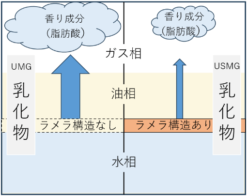 この現象は、X線回折測定にて30℃のUSMGの界面に観察された、長さ44.5Åのパルミチン酸モノグリセリド2鎖長の繰り返しで形成されるラメラ構造により、脂肪酸(香り成分)のガス相への放出が抑制されたことによると推察されます。