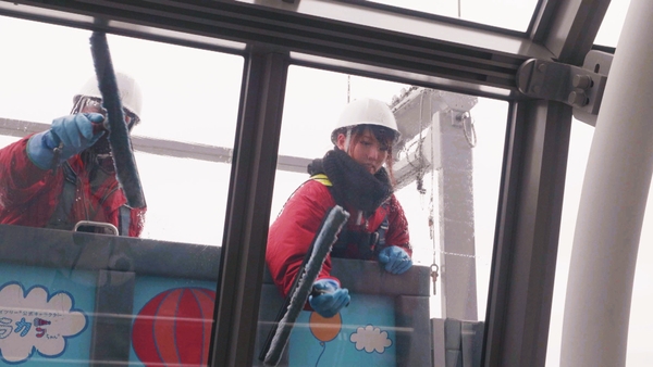 先輩と清掃用のゴンドラに乗り込み、清掃開始!