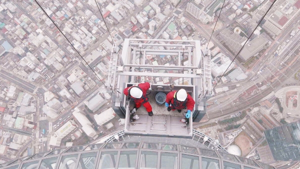 高さ634メートルを誇る世界一高い電波塔、東京スカイツリーの窓拭き清掃員・庄子さん。