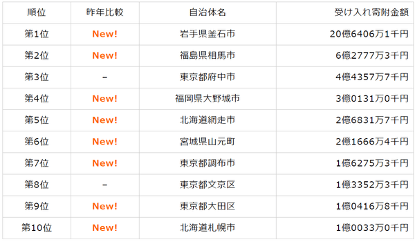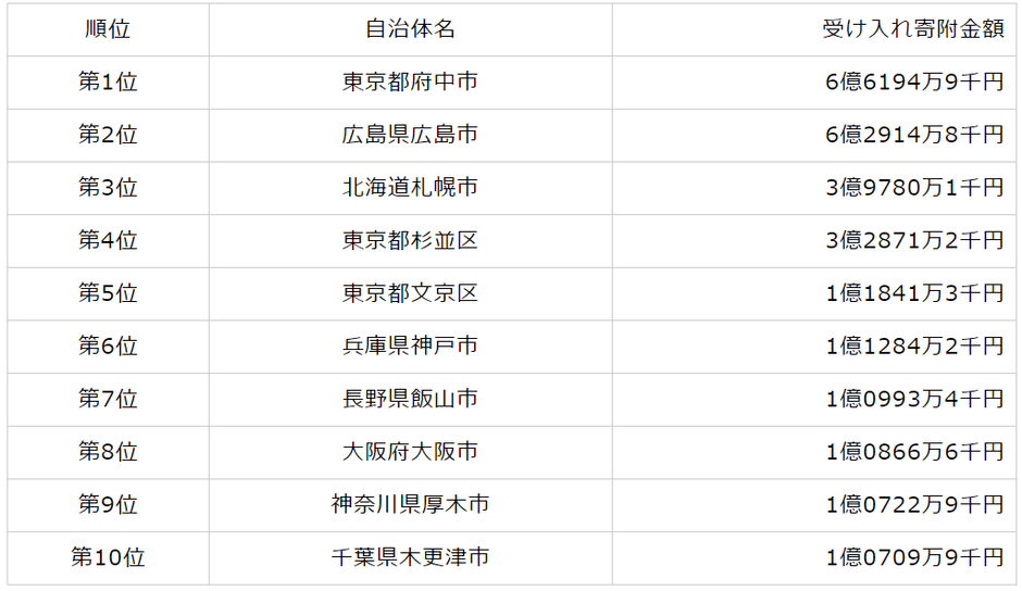 そのため、東京都の各自治体や地方の政令指定都市などが受入金額の上位を独占しており、地方の小さな自治体は全く寄付金が集まらない状態でした。