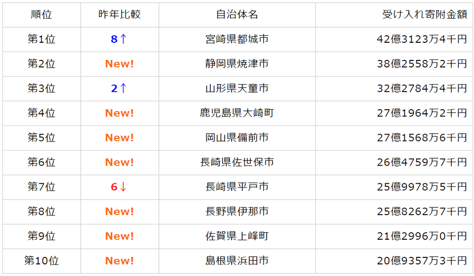 2015年は「干物」の返礼品が有名な静岡県焼津市、「うなぎ」の返礼品が有名な鹿児島県大崎町などがTOP10入りをしています。