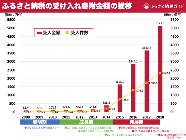2008年から始まった2011年に東日本大震災の災害支援の一つの形として注目を浴び、その後2012年のふるさとチョイスOPEN、2014年のふるなび、さとふるOPENといった複数のふるさと納税サイトの開設によって世間一般への認知が広がっていきました。その後、2015年の制度改正により控除限度額が2倍になった後の返礼品競争の激化により一気に受け入れ寄附金額が増加していきました。