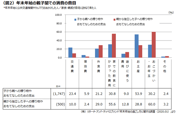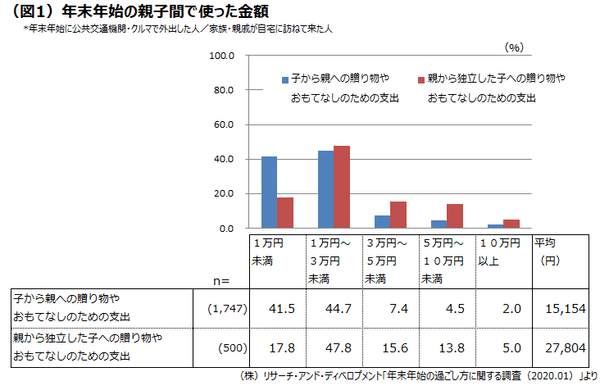 年末年始は、何かと出費が多いもの。子から親へ、親から子へ、どれだけお金を使ったのでしょうか。株式会社リサーチ・アンド・ディベロプメント(所在地:東京都新宿区、代表取締役:松田 武久)では、この年末年始に公共交通機関・クルマでお出かけした人、家族・親戚が自宅に訪ねて来た人に親子間での支出について調査をしました。